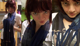 Well, over the weekend I finally got my sewing machine back from the repair shop and I'm way too excited to be sewing with a machine again. My first order of business was to finish off a scarf that I'd been painstakingly handsewing (it was rather depressing that I'd spent hours and hours on this thing, and with the machine it only took an hour to finish). Pictures!
