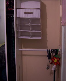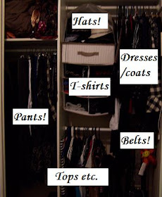 Time to start reorganising! I'm starting with my "things I wear" pile. I whip out my $29.95 hanging cupboard thingy, and stick it in there. Ah, how clean my wardrobe looks with no clothes in it! (Note, I decided to leave the novelty flower, because it makes me smile every time I go to get dressed!) I sort my t-shirts into piles of dark shirts with graphics, bright colours with graphics, light colours with graphics and plain t-shirts. Then I fold 'em, and put them into the shelves on the hangy thing. I decide the big space at the top is the best place to put hats, and scarves, tights & various accessories make their way into the drawer. (I also took pictures of the things I put in the drawer so I can stick them on the front and always remember what's in there, but I can't put them up yet as I have no coloured printer ink!) Everything else from the "things I wear" pile gets hung up, and put neatly back into the closet.