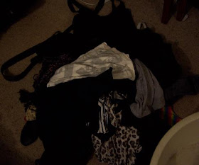 Now, since I'm feeling positive after handling the pile of things I wear, it's time to start on the "things I don't" piles. The things that need mending get taken to my sewing room, and I decide that I'm going to get rid of all the things that don't look/fit right. Which just leaves me with the "what the hell do I wear with this?" pile. Since I'm trying to do this all in one night, I don't really have time to do what my guide suggests - wear one of these items each day and then take notes on how I feel, if I can imagine wearing the item with other things, and whether there is something else that could make the item more wearable. So instead, I pick up each item in turn and ask 2 questions: "can I think of at least three other things in my wardrobe that this would go with?" and "Is there any way I can change it to make it go with more items?" If the answer is yes to at least one of these questions, I hold onto it. If I come up with two no's, then it's bye bye baby. I'm being particularly ruthless this time, and cutting free a few choice items that have been hanging around in my wardrobe because of nostaligia (eg. a top my boyfriend really likes that is now too big for me to wear), because they were such a good buy (cue, ill-fitting jeans for $10) and because I "keep meaning to wear them" ( if you haven't taken the tags off after a year sister, you ain't gonna!). Check out my huge "to get rid of" pile.