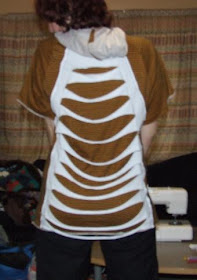 After a long dry spell where creativity is concerned, I have some DIY action for you. Some of you may remember the Wolverine Slasher Skirt (which, coincedently I wore the last time The Boyfriend and I went to the Gold Class Cinemas - apparently old ladies do not approve). Well, it now has a cousin. Made from another one of the $2 Wolverine T-shirts I got from Sanity, and some stretchy striped material from Spotlight, here is the Slasher Hoodie.