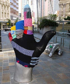 "Some of the I Knit Brisbane public art installations in the CBD include a glove covering the two metre tall Sebastian de Mauro 'hand' sculpture at 175 Eagle Street, a giant silk spider web and feature spider on St Francis House in Elizabeth Street, giant balls of wool in Reddacliff Place, a crocheted garden in King George Square and cosies for the Goodwill Bridge at South Bank."