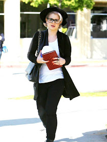 Little bit newschool Kelly, little bit oldschool Kelly. I'm really, really digging the spiky hair and glasses combo. Plus, the cute layering, and cropped pants that show off her beautiful foot tattoos? Gold, pure gold I say!
