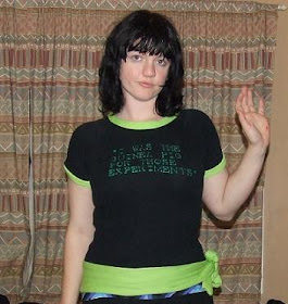 This one was serious t-shirt surgery with the objective of saving one of my favourite t-shirts. It may be too much information but I have recently, shall we say, "grown" from a B cup to a D cup, leaving most of my upper body garments a little short. I added the lime green pieces (thrifted fabric) using