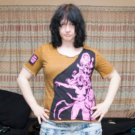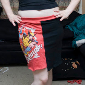 This is the Wolverine Slasher Skirt Mark 2. I used up two t-shirts to make this (and, the last of my Wolverine t-shirts!). Also, the waistband is not actually lumpy like that. Dammit, I always stand wierd for my DIY photos.