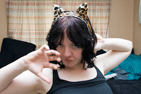 Cat ear headband! I took a headband I never wore, and attached ears made from a thrifted leopard-print velour bag. BEST HEADBAND EVER.