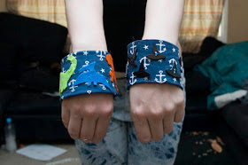 This shirt I made from scratch, using the my last metre of this striped fabric, and the t-shirt patten from my TAFE course. The Marvel Superheroes graphic came from a thrifted t-shirt, which I'm pretty sure was a kids shirt. The little piece on the arm has their names on it: Storm, Phoenix and The Invisible Woman.