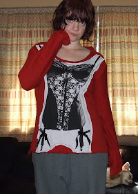 This is another jumper made from op-shop fabric. I got this beautiful soft red woolen fabric for around $2. The corset print came from a t-shirt I impulse bought from work, only to realise that the quality of the shirt was really poor, and the print sat weirdly high on my chest. So, the logical fix was to cut the print out and sew it to a jumper. OBVIOUSLY. I made this one a little longer than the other one, and made longer sleeves - otherwise I stretch the arms of my jumpers trying to cover up my freezing iceblock hands in Winter.