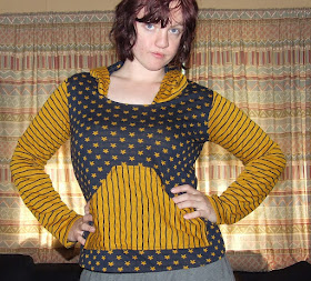 'Nother shot, showing off the stars on the inside of the hood. I made this one from scratch, using a t-shirt pattern from one of the TAFE sewing courses I did last year, and adding the hood, pocket & long sleeves. I attached the hood a little wonky by accident, but I don't really care.