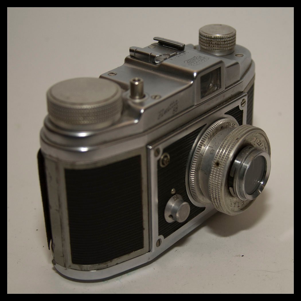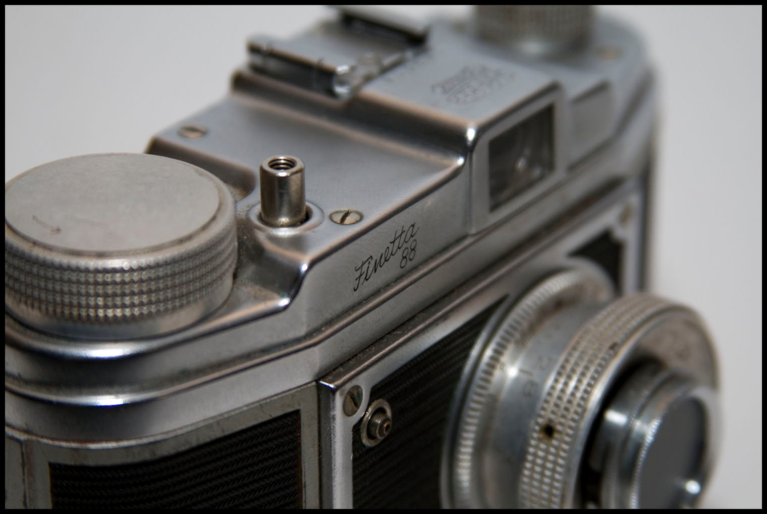 Again, I rely on The Boyfriend for technical wisdom - "This is a Saraber Finetta 88 35mm viewfinder camera. Seems to be working, and uses regular 35mm film. No hinges, to open it the whole back & bottom comes away after undoing a bolt on the bottom, fully mechanical - no built in meter. Produced sometime between 1953-1956. Interestingly, it does have a removeable lens, though according to the info online there was only 2 other lenses available for it."