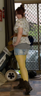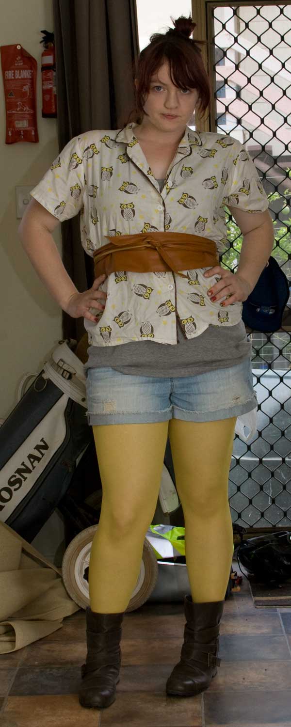 This was probably my favourite outfit of the whole week. And, I'm still being surprised by how versatile a pair of yellow tights can be. When I get back to Brisbane, I think I'm going to have to go to that random tights stall and stock up on a few different colours. Tights help me feel like I'm not naked, but they aren't too hot for the weather up here (yet). Oh, last time I wore this owl-print button-up Sarah Misfit asked for a close-up of the print - here you are darling: