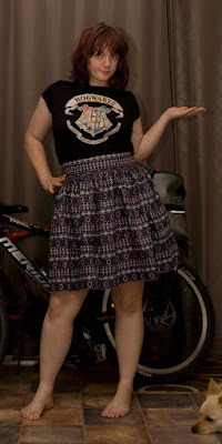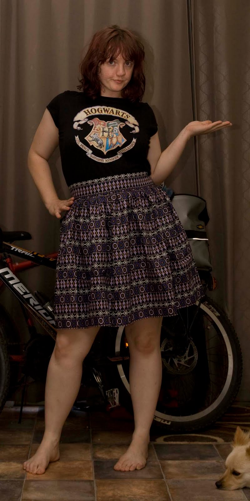 A cute mini-skirt, which I used this tutorial of Max California's to make. I only used one fold-over band at the top, instead of adding another one at the bottom. I'm undecided though, I may add a bottom band later if I feel like it needs one. I also used plain old fabric instead of a t-shirt.This fabric (which is my personal favourite of the bunch):