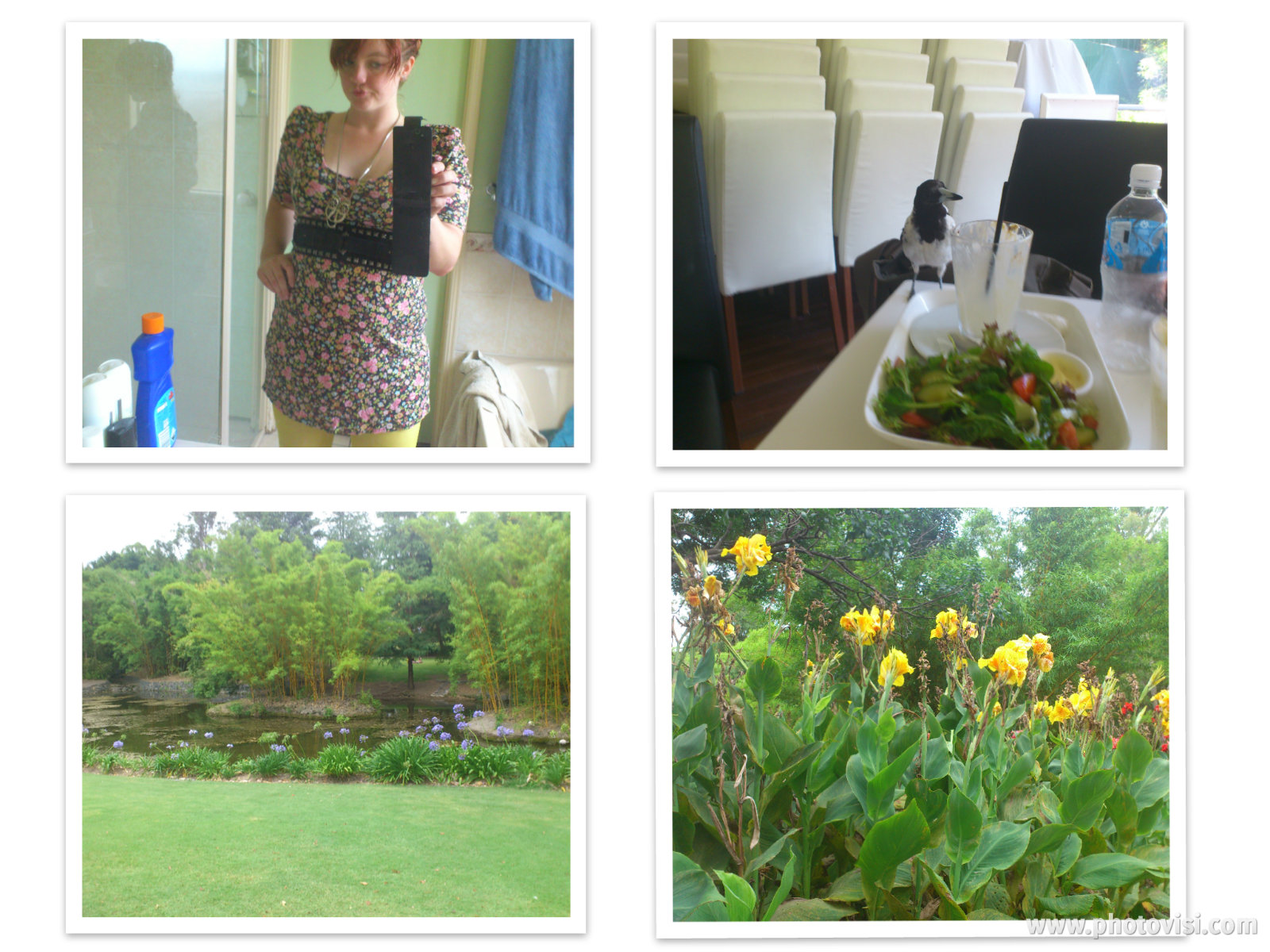Clockwise from top left: rushed outfit photo in the mirror in Brisbane, me rejoicing when the road signs finally start saying we're close to Brisbane, Shannons family dogs kissing, & our shopping for photography supplies (including an $800 macro lens that I managed to destroy less than two days later).Clockwise from top left: Another rushed mirror outfit photo, a magpie that came to join us for lunch at the Mt Coot-tha Botanical Gardens, some flowers from the Gardens that matched my outfit, & the view out over the pond at the Gardens.