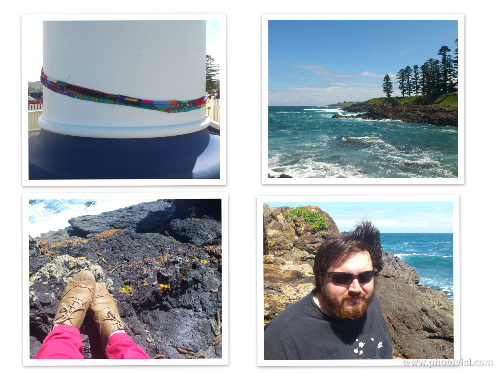 Clockwise from top left: Guerilla knitting on a lighthouse in Kiama (it says something like "Isn't it funny that public servants decide what is art and what is vandalism, haha"), the view from one of the headlands at Kiama, The Boyfriend's lovely face at Kiama, & my lovely shoes at Kiama.
