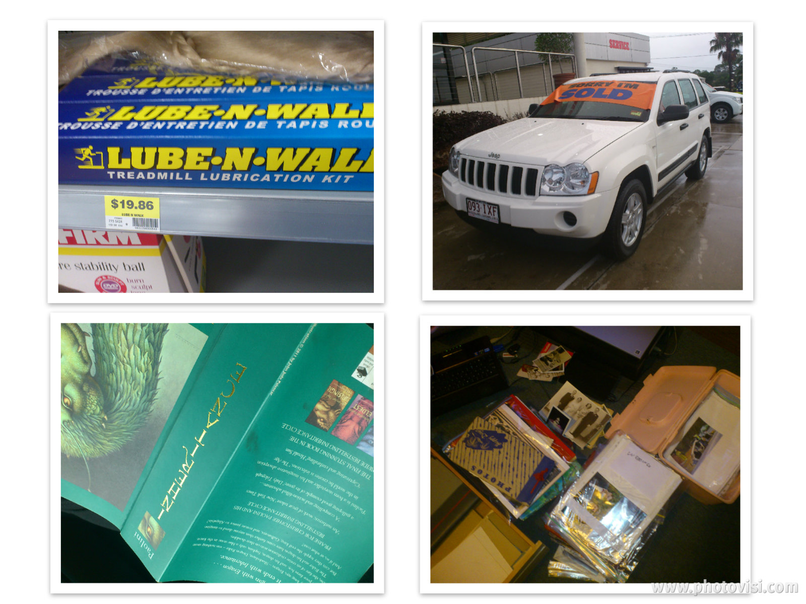 Clockwise from top left: Unfortunately named products in Wollongong, the beautiful Jeep we acquired in Brisbane, The Boyfriends Nanas' huge collection of photographs, & my reading material for the drive.