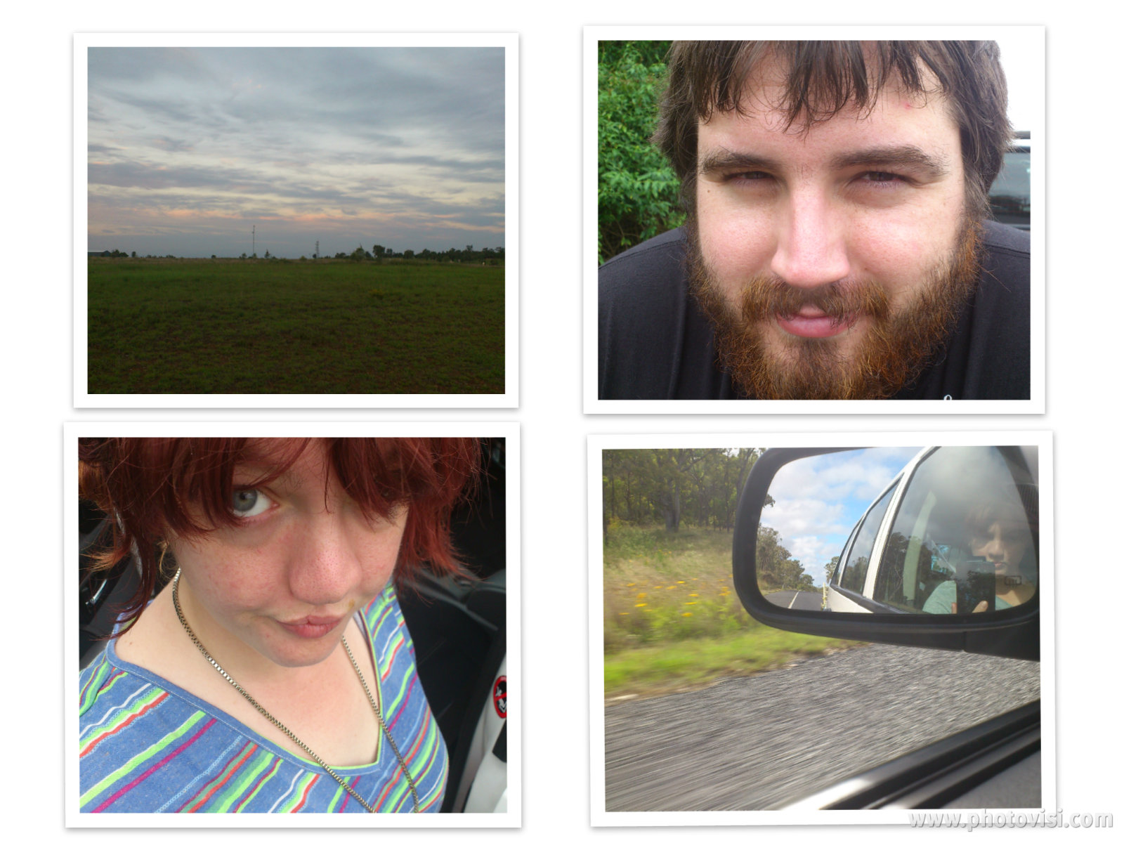 Clockwise from top left: sunset on the night we left Clermont, The Boyfriend when we reached Hervey Bay, Me trying to be artsy in a moving car on the way to Brisbane, & me in Brisbane.